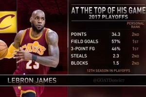 美媒晒詹姆斯17年季后赛:34.3分2.3断1.5帽三分46% 2K里都做不到