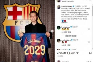 德容社媒晒出手拿续约纪念球衣的照片,配文:“我非常高兴和自豪能够与我一直梦想效力的俱乐部续约。我从来就没有B计划,期待在未来更多年里与大家共同努力、共创辉煌,巴萨万岁。”