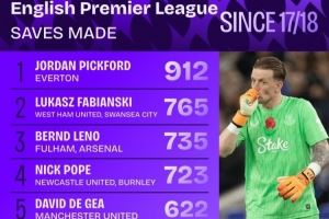 - 2025-11-1917-18赛季至今英超门将扑救榜:皮克福德912次居首 法比安斯基第二